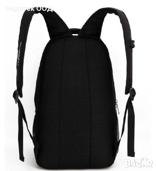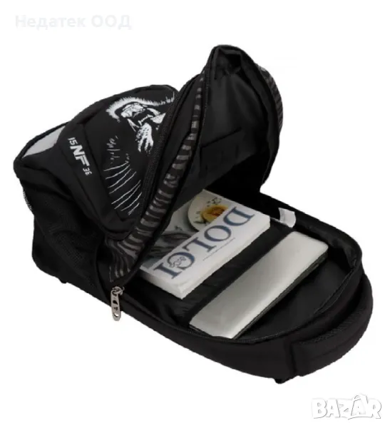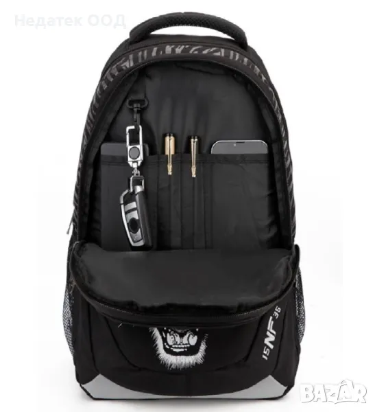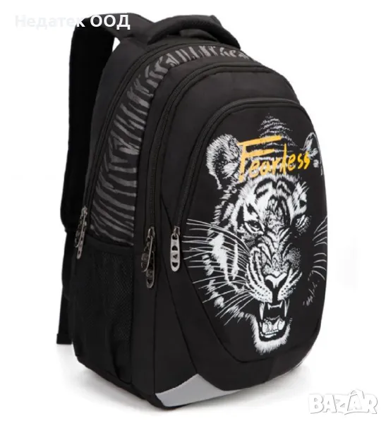 Ученическа раница, черна, с дизайн на тигър и надпис "Fearless". Има 2 големи пространства, 1 джоб отпред и 2 странични джоба с мрежа. Има мек гръб, дръжка и презрамки.