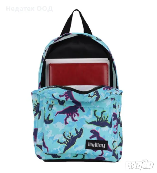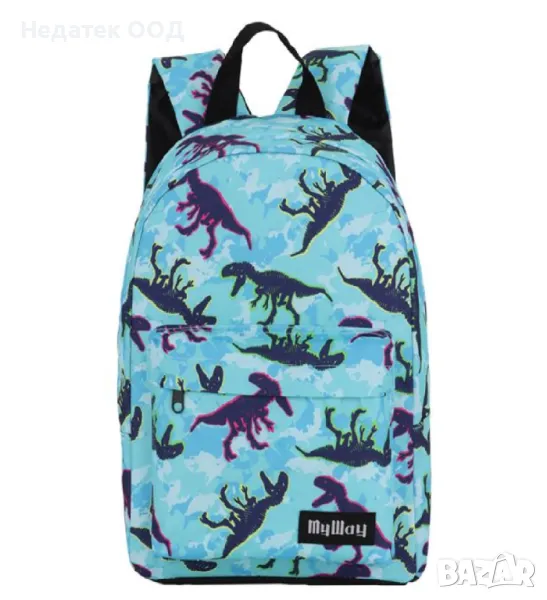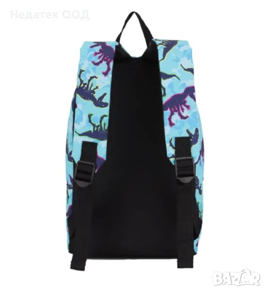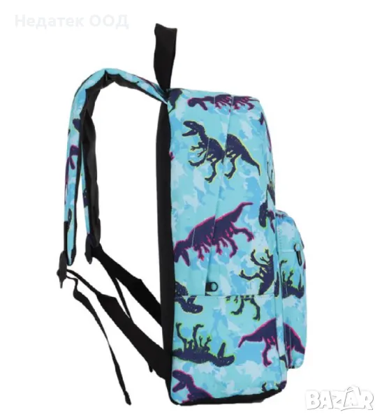 Ученическа чанта - гръб за детска градина в тюркоазено и синьо с дизайн на динозаври. Има 1 голямо отделение и външен джоб с цип, регулируеми презрамки, мек гръб и дръжка за носене.Побира всички необходими ученически пособия и прави ежедневното пътуване на детето по-лесно и забавно!