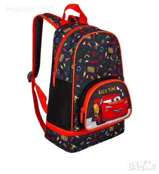 Едноместна ученическа раница за момчета с преден джоб с шарки Cars, страничен мрежест джоб и изотермичен джоб с цип в долната част. Има издръжливи ципове и регулируеми презрамки.Побира всички необходими ученически пособия и прави ежедневното пътуване на детето по-лесно и забавно!