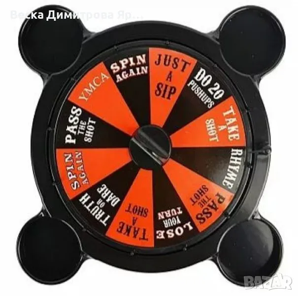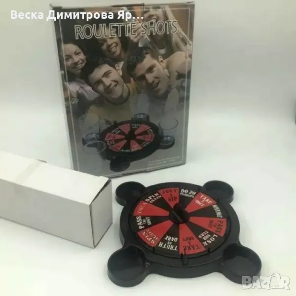 Добавете повече забавление и вълнение към вашите партита със забавната алкохолна игра "Рулетка"! С диаметър на рулетката от 30 см и изработена от висококачествени материали като пластмаса и стъкло, тази игра е идеална за всяко събиране. Правилата са изключително прости: завъртете черната стрелка, изпълнете действието, което ви се падне – изпийте чаша, пропуснете ход или завъртете отново! Комплектът включва 4 стъклени чаши, което я прави идеална за малки групи. Осигурете си незабравими вечери с много смях и приятни моменти с тази уникална игра.