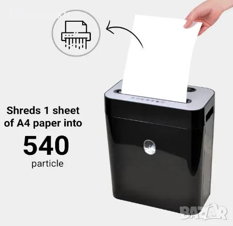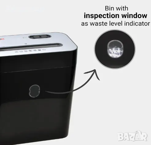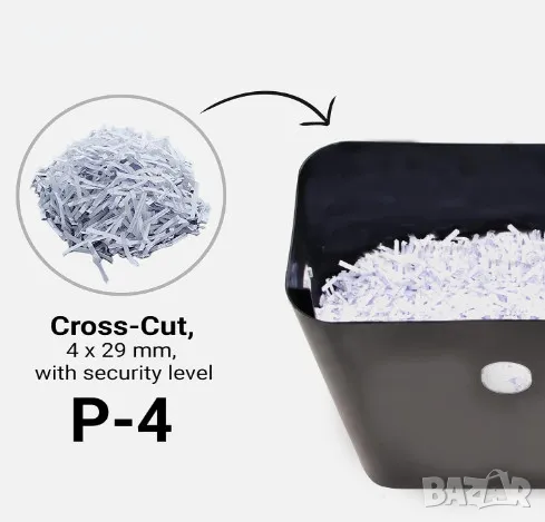 Унищожава 1 лист A4 на 538 малки парчета от 4x29mm (DIN P4). Чрез удобен прозорец за наблюдение се вижда дали шредера е пълен.