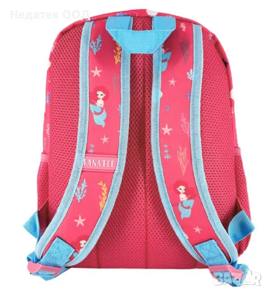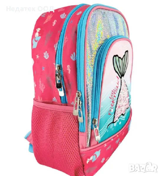 Розова ученическа раница за момичета, 2 джоба, 1 голям джоб, 2 мрежести странични джоба за чанта и дизайн на опашка на русалка с вълшебни пайети, с преливаща се рамка, послание на малката русалка и холографски блясък. Разполага с вътрешно ухо в предния джоб за информация на детето, здрави ципове и регулируеми презрамки.