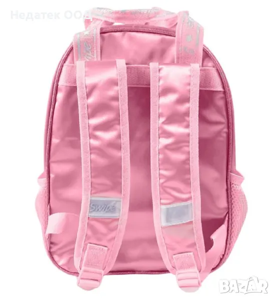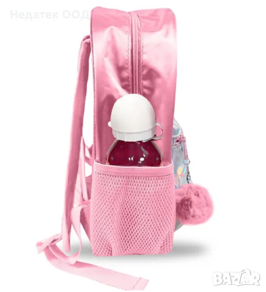 Ученическа раница за момиче, розов цвят, с многоцветен блясък, 2 джоба, от които предният е с холографски дизайн, с 1 голям джоб, 2 странични мрежести джоба за чанта и холографски дизайн на звезда, еднорог и ключодържател с помпон . Има издръжливи ципове, регулируеми презрамки със светлоотразителни ленти и 2 дръжки, които се затварят с метално копче.