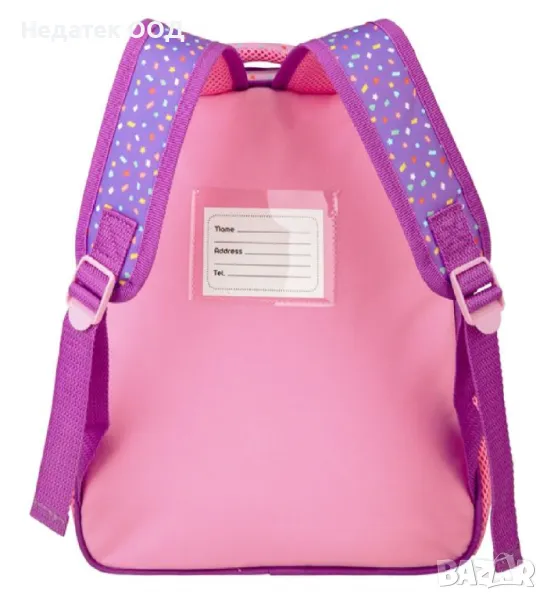 Розова лилава ученическа раница за момичета, 2 джоба, 1 голям джоб, 2 мрежести странични джоба и дизайн Peppa. Има раздел на гърба за информация на детето, издръжливи ципове и регулируеми презрамки.