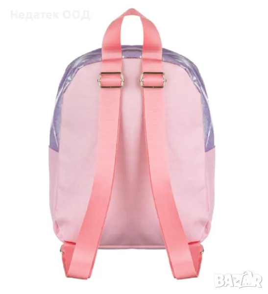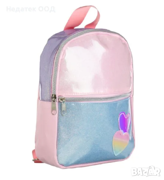 Раница за момиче, розова сребриста раница с холографски блясък. Има голямо отделение и преден джоб със сърца, сребрист цип и розови презрамки.Пасва на всички аксесоари на разходката, има закачлив дизайн и весели цветове!