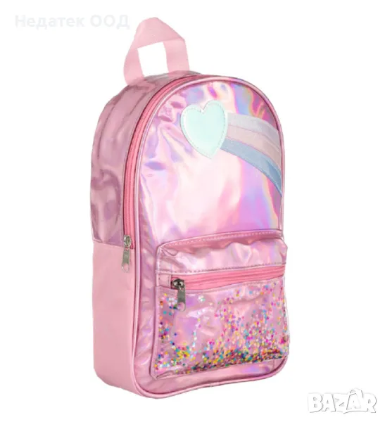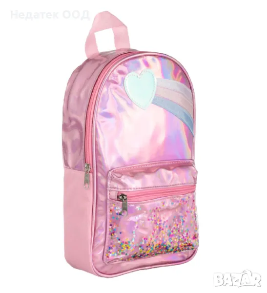 Раница за момичета, розова холографска раница, дизайн на дъга със сърце. Има голямо отделение и преден джоб с цветни конфети, розов цип и розови презрамки.Пасва на всички аксесоари на разходката, има закачлив дизайн и весели цветове!