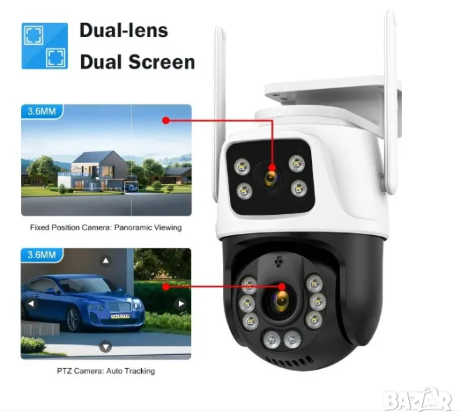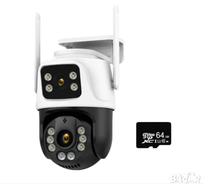 + карта 64GB А0018 ICSEE Външна водоуст двойна камера 6MP 360° въртяща цветно нощно