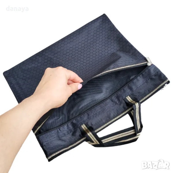 Чанта за документи с размери 36.5 x 30 см, изработена от здрав и висококачествен промазан плат. Тази чанта е перфектният избор за всеки, който иска да носи документите си сигурно и с лекота, без да прави компромис с елегантния външен вид.