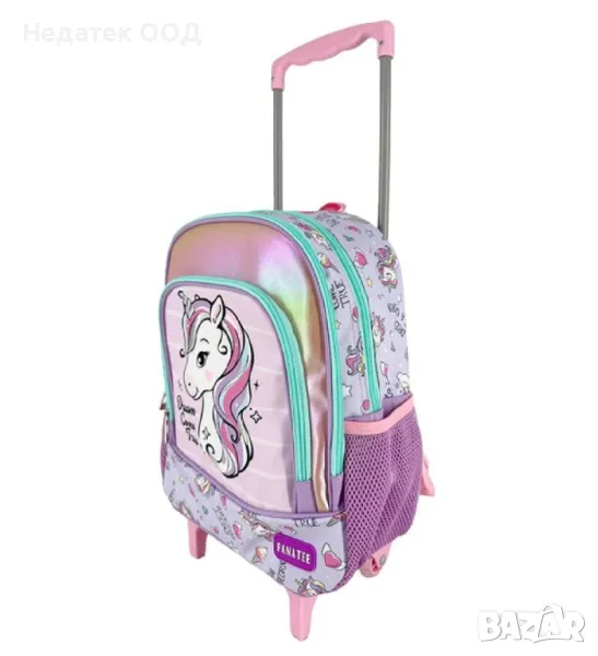 Ученическа раница на колелца, Fanatee, еднорог, розов, 24х12х33см