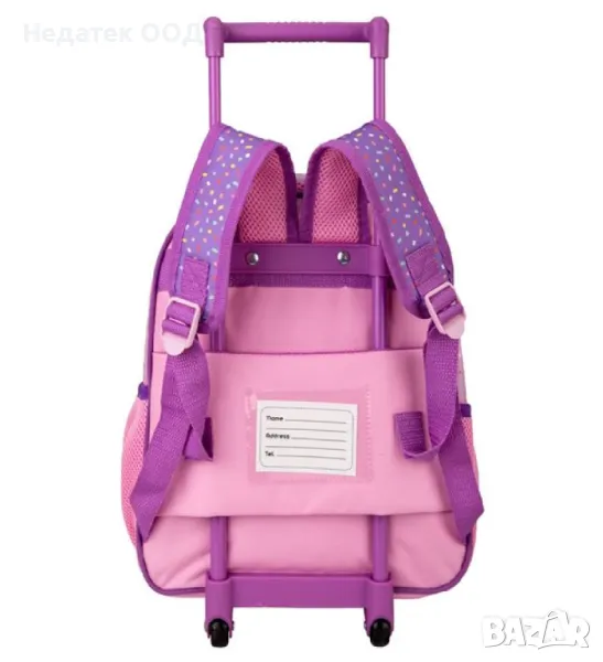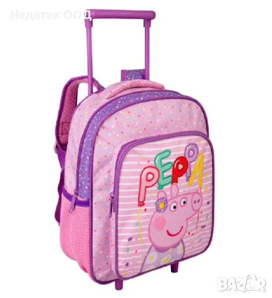 Ученическа чанта - количка за момичета, 2 джоба, с 1 голям джоб, 2 мрежести джоба отстрани и Peppa дизайн в розово и лилаво. Има външно ухо на гърба за информация на детето, издръжливи ципове, регулируеми презрамки и дръжка тип P с височина до 56 см.Побира всички необходими ученически пособия и прави ежедневното пътуване на детето по-лесно и забавно!