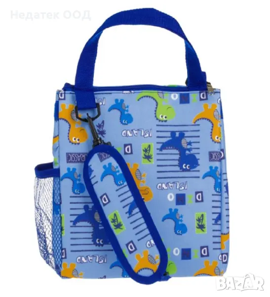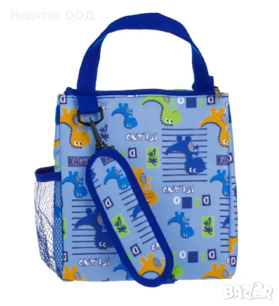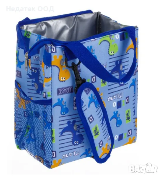 Правоъгълна изотермична индивидуална чанта за обяд за момче в цвят сиел и синьо с дизайн на динозавър в различни цветове. От външната страна е изработена от пластифициран материал за лесно и бързо почистване, а отвътре е с покритие, което спомага за запазване на температурата на храната. Има мрежест джоб отстрани, затваря се с цип в синьо, има хриц храсти отстрани, за да стои стабилно изправен и се носи лесно с късите дръжки или дългата регулируема презрамка.