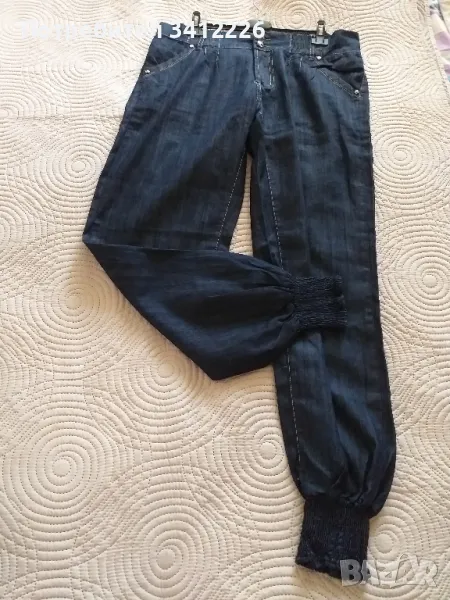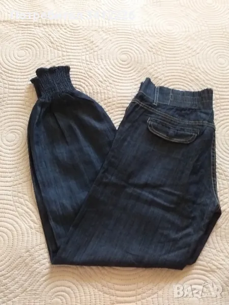 Дамски дънки с ластик на талията и крачолите. Тънка памучна материя . Размер L /XL .