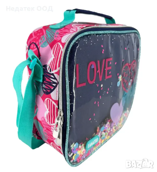 Изотермична чанта за храна с цветно сърце в цвят върбинка, розово и синьо и послание "Love". Разполага с 1 място за храна, плодове или лека закуска на детето и за кърпа или сок. Има дръжка и дълга презрамка.