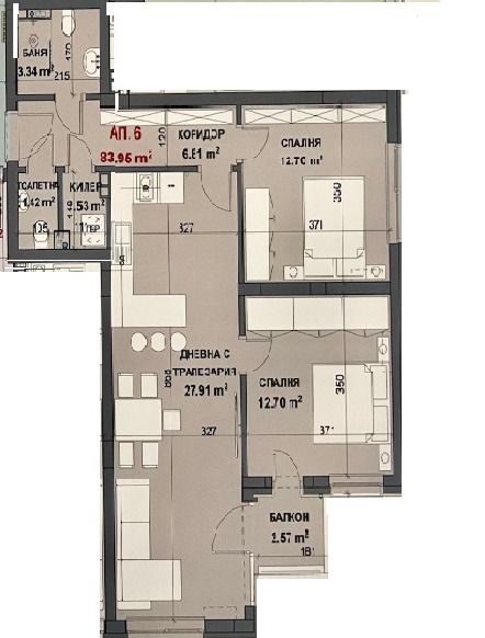 Просторна всекидневна с кухненски бокс,две спални,две тоалетни,мокро помещение и тераса.