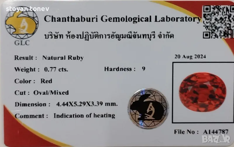 рубин с тегло 0.77кт. и произход Мадагаскар. Чистота VS - с едно включение видимо с невъоръжено око. Цвета е червен. Овал с размери: 6.33 x 4.48 x 2.94mm.