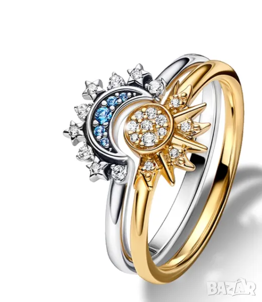 Нежен пръстен с камъни с оригинален дизайн "ден и нощ". Пръстенът е от два части, може да се носи заедно на един или на различни пръсти.