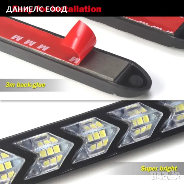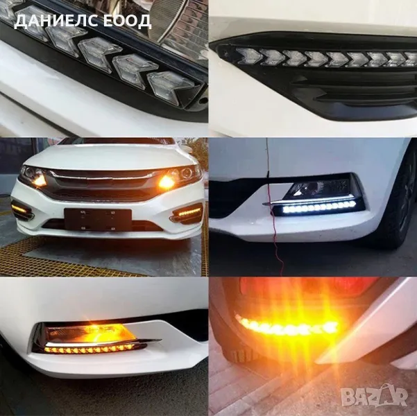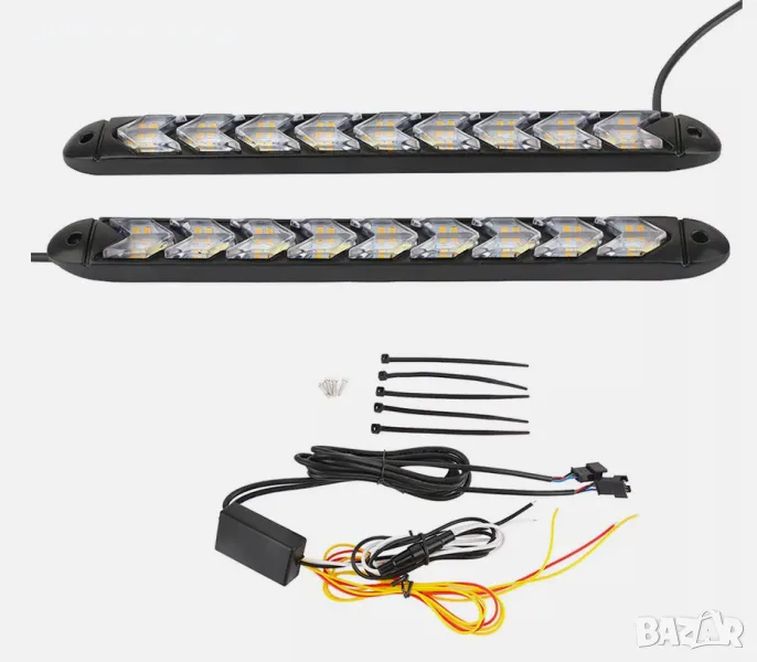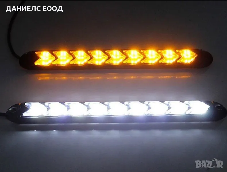 Универсални водоустойчиви диодни (LED) дневните светлини придават по-нов и различен вид на автомобила и са добър аксесоар за всеки шофьор. Светят с ярко бяла светлина и притежават модерен дизайн като същевременно придават съвременен вид на вашия автомобил. LED светлините са с вграден бягащ мигач и имат модерен дизайн, който придава завършен вид на автомобила. Изработени са от висококачествени материали с мощни 9 диода всеки с по 2W. Този модел дневни светлини са с вградена функция бягащ мигач при подаването му диодите излъчват оранжева светлина, а през останалото време светят в бяло. Корпуса е еластичен и могат да се монтират на огъната плоскост с двойнолепяща лента, или с рапидки в двата края.