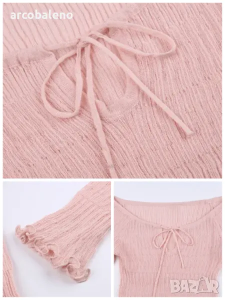 Този пуловер с връзки и дълги ръкави с V-образно деколте и отворени рамена е изработен от 95% полиестер и 5% спандекс и се отличава със стилен дизайн. Той е идеален за ежедневни поводи и може да се носи през всеки сезон. Уникалният модел и откритите рамене го правят задължително допълнение към вашия гардероб.