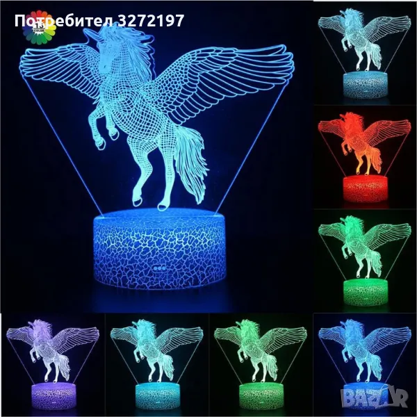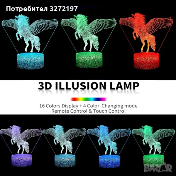 Холограмна 3D LED лампа Кон еднорог -дистанционно управление 16 цвята+други режими на управление