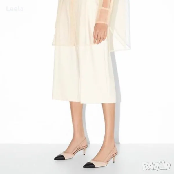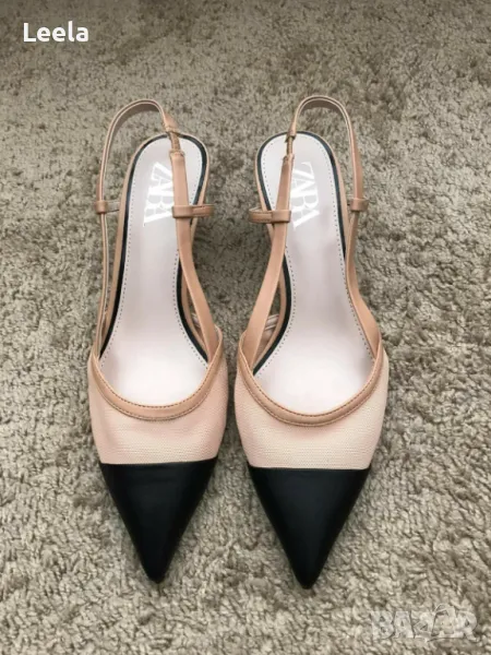 Дамски обувки Zara с нисък ток и отворена пета, в контрастни цветове - черно и пудра, по модел на обувките на Chanel.