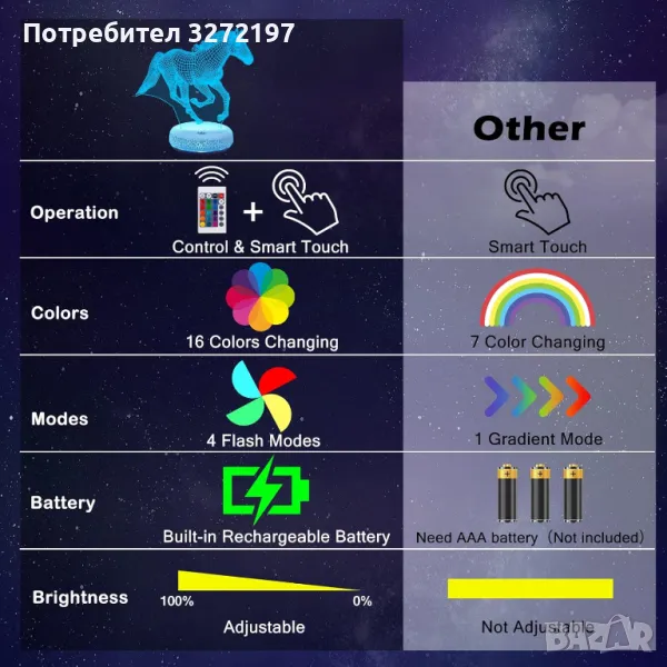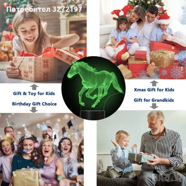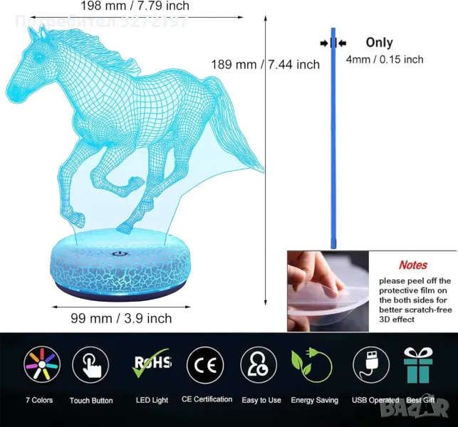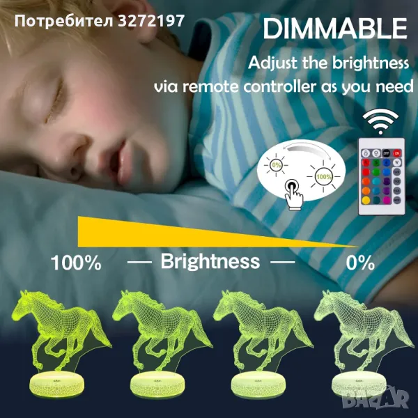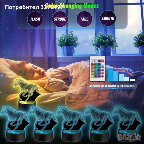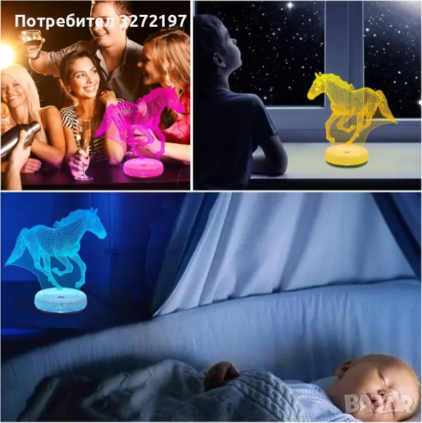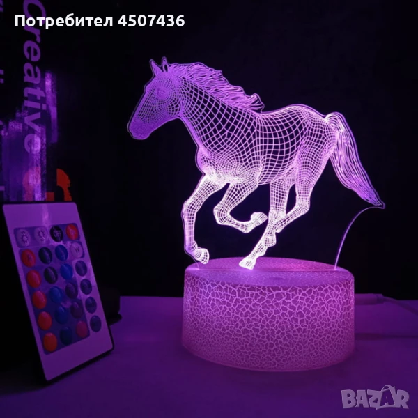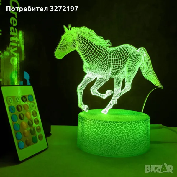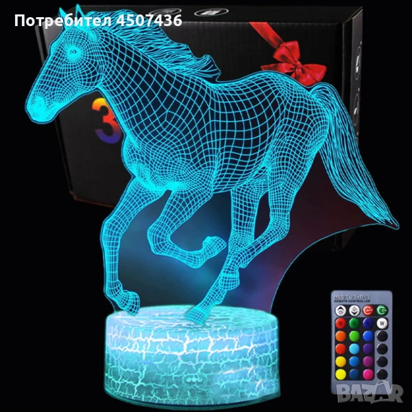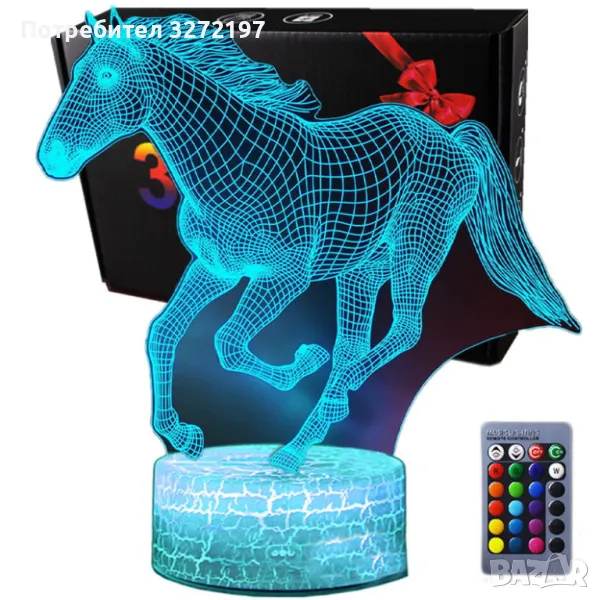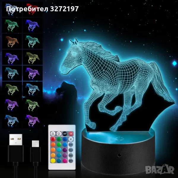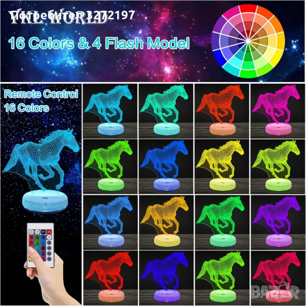 Холограмна 3D LED лампа Галопиращ Жребец-дистанционно управление 16 цвята+други режими на управление
