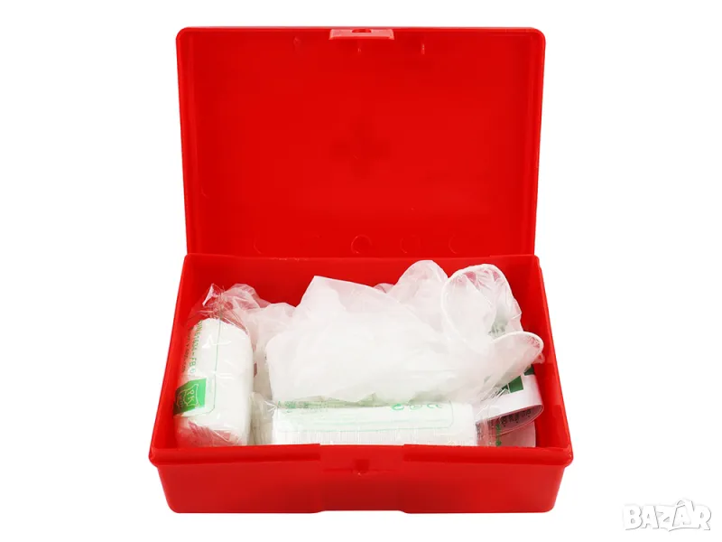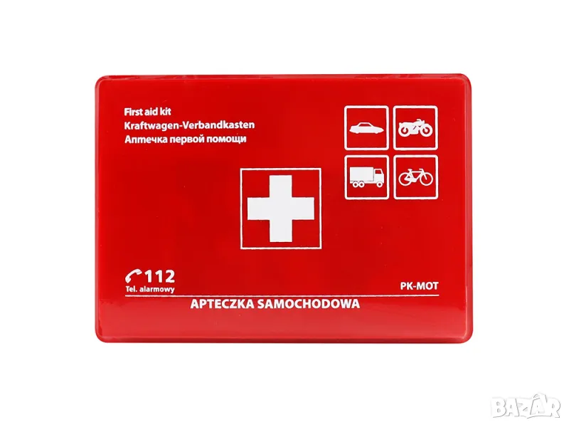 Автомобилна аптечка с кутия изработена от PVC пластмаса. Корпусът на аптечката е устойчив на атмосферни условия.