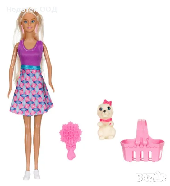 Играчка кукла 30см, за момиче, с руса коса, кошница с малко куче.