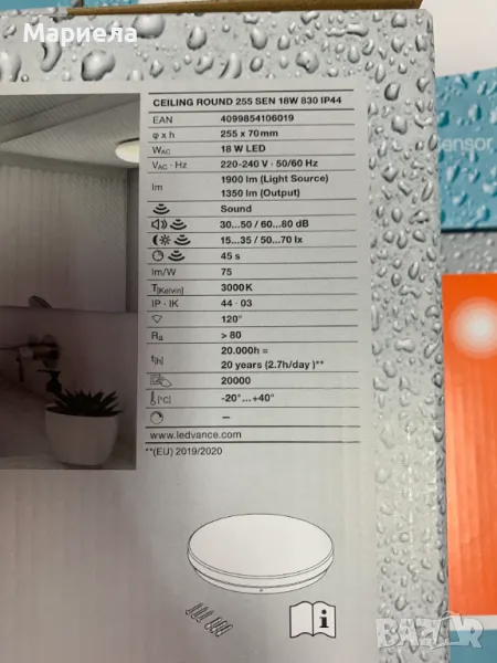Ledvance LED плафон IP44 18W - 3000K sound sensor