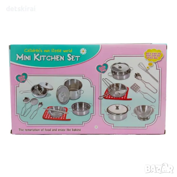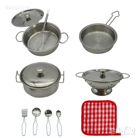 Комплект кухненски прибори от неръждаема стомана за деца Играта за готвене учи на самочувствие и приготвяне на основни ястия. Вашето дете обича да е заето в кухнята, да приготвя храна, да създава всякакви сценарии и необичайни ястия. Детето развива своята креативност и ръчни умения чрез игра. Може би ще развие интерес към готвенето. Комплект тенджери ще бъде полезен за всеки малък готвач. Тенджерите и приборите са с цвят металик, който пасва на всяка кухня и са изработени от неръждаема стомана. Време е за голямо готвене!