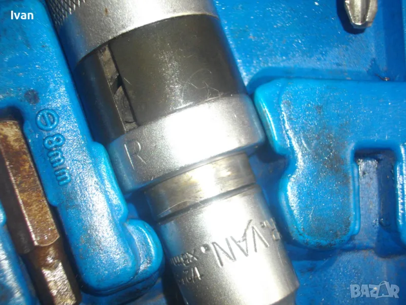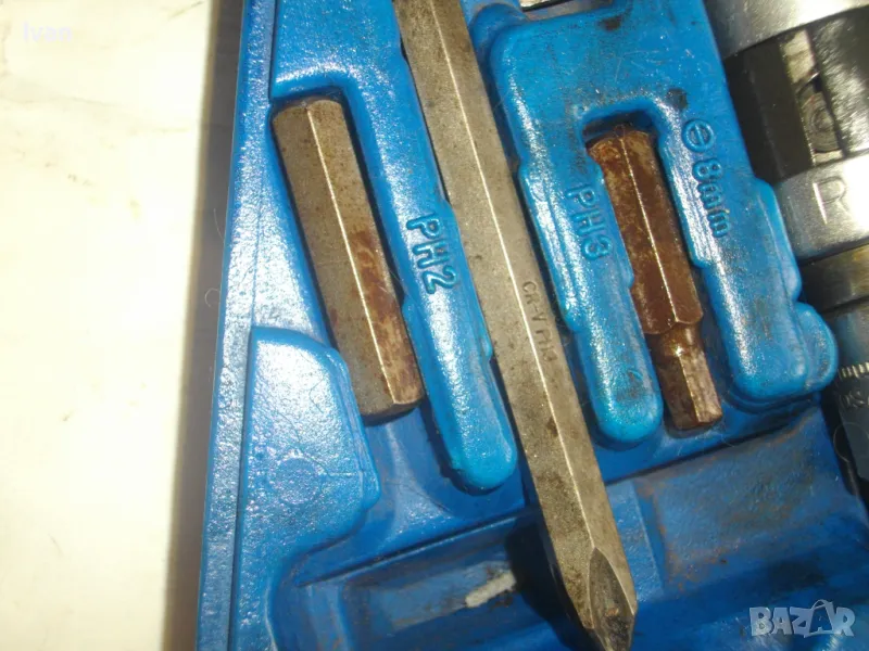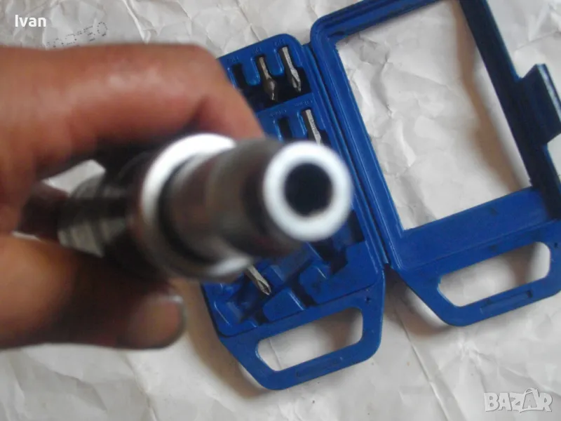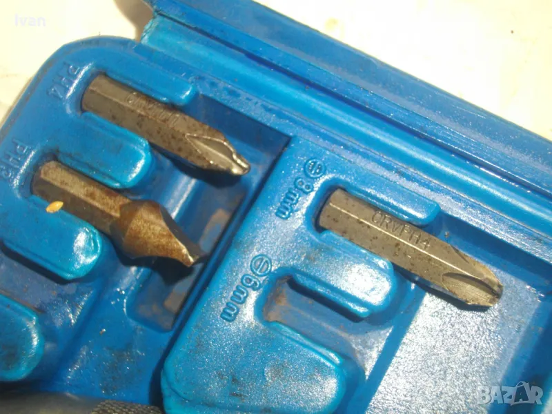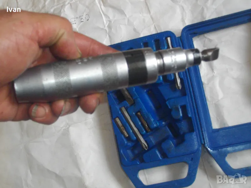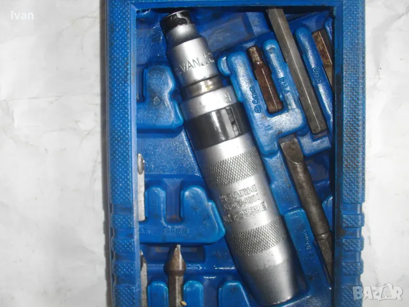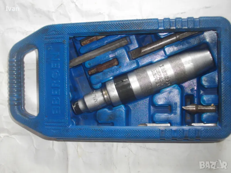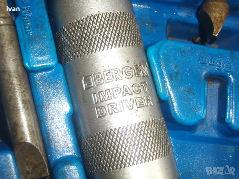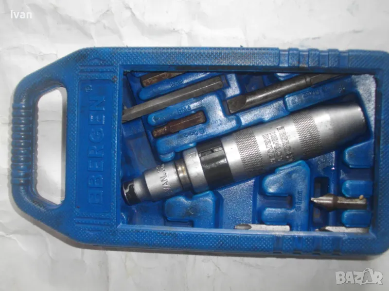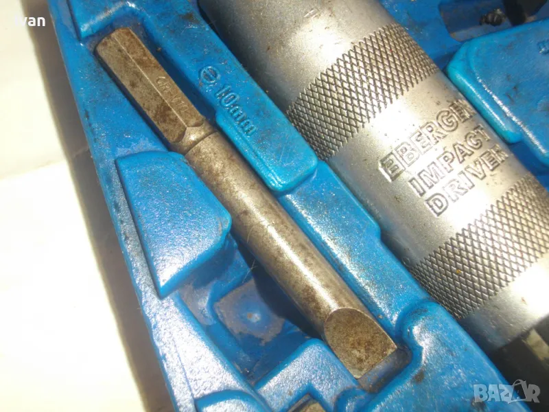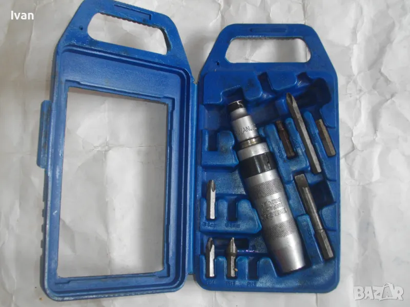 ударна отвертка. Комплект са накрайници. Професионална немска. Марка BERGEN IMPACT DRAIVER. CR VAN 1/2 SQ. DR. x8mm HEX. Ударните отвертки с накрайници са изработени от хром-ванадиум и имат антикорозионни свойства. Присъединяването става чрез сачма със способ за променяне на посоката (ляво/дясно). Реверсивна - смяна посока лаво-дясно. Масивна. Малко ползвана. В отлично работно състояние. Дължина 160 мм. Горен диаметър ф 25 мм. Накрайници битове и адаптер общо 8 броя различни по захват и дължина. Комплектът е прибран в оригиналната си пластмасова кутия с фабричното лого. Приблизително тегло - 1,5 кг. На Бергер ударните отвертки нови са средно около 160 лв.