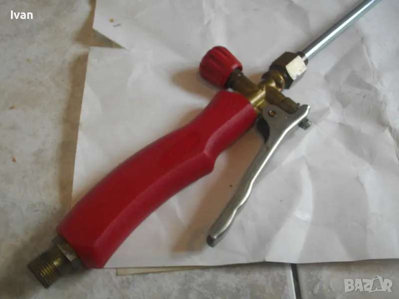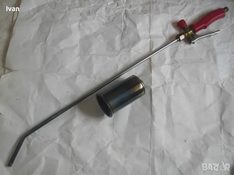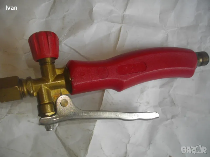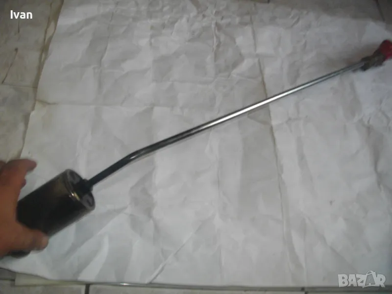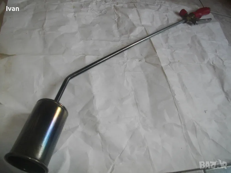 ОПИСАНИЕ на газова пропан-бутан горелка за хидроизолации покриви - цена 99 лв. Немска професионална CFH. Почти нова - 90 см обща държина - чашка за пламъка ф 70 мм - със спусък. Без маркуч и без клапан редуцир вентил ниско налягане. Горелката е почти нова и в отлична работно състояние. Спрателен кран на главата над спусъка. Пластмасово масивно покритие на дръжката. Присъединителна резба на дръжката за универсален маркуч за газ пропан-бутан. Размер на резбата - стандартен - М 15. Мога да предложа маркуч 5 м и редуцир вентил различни към нея на цени по споразумение.