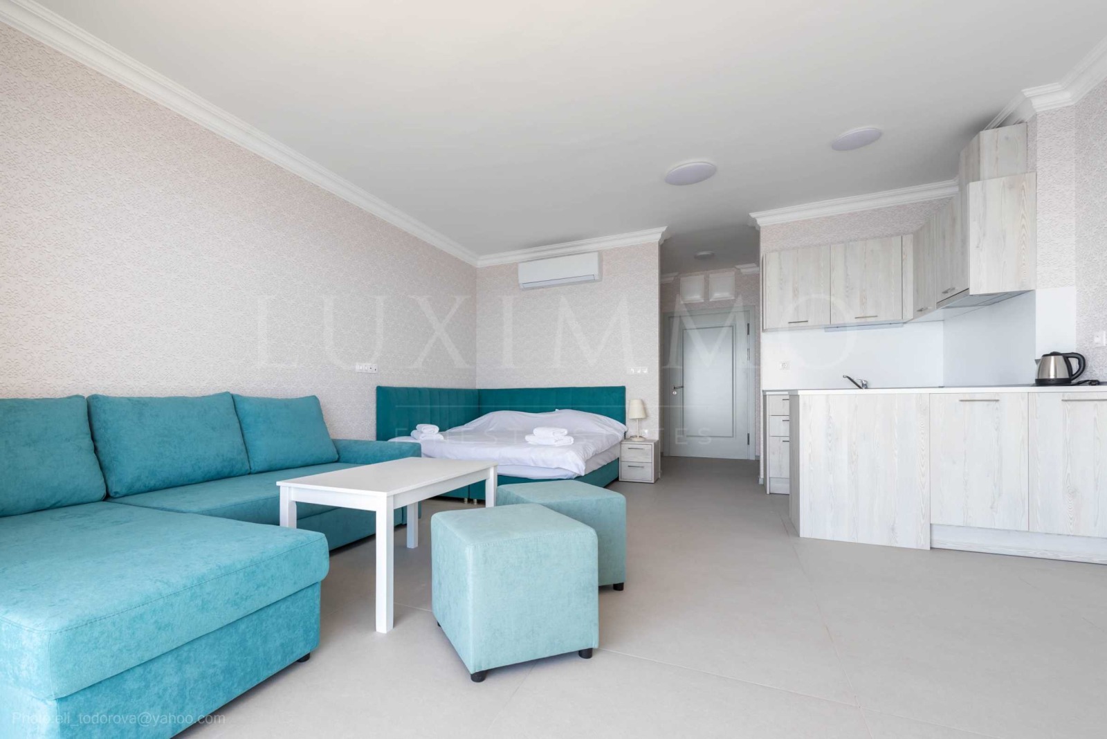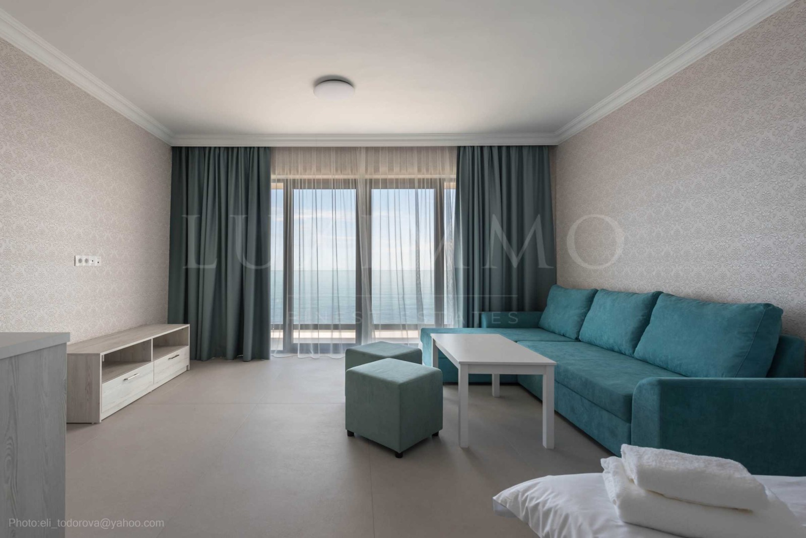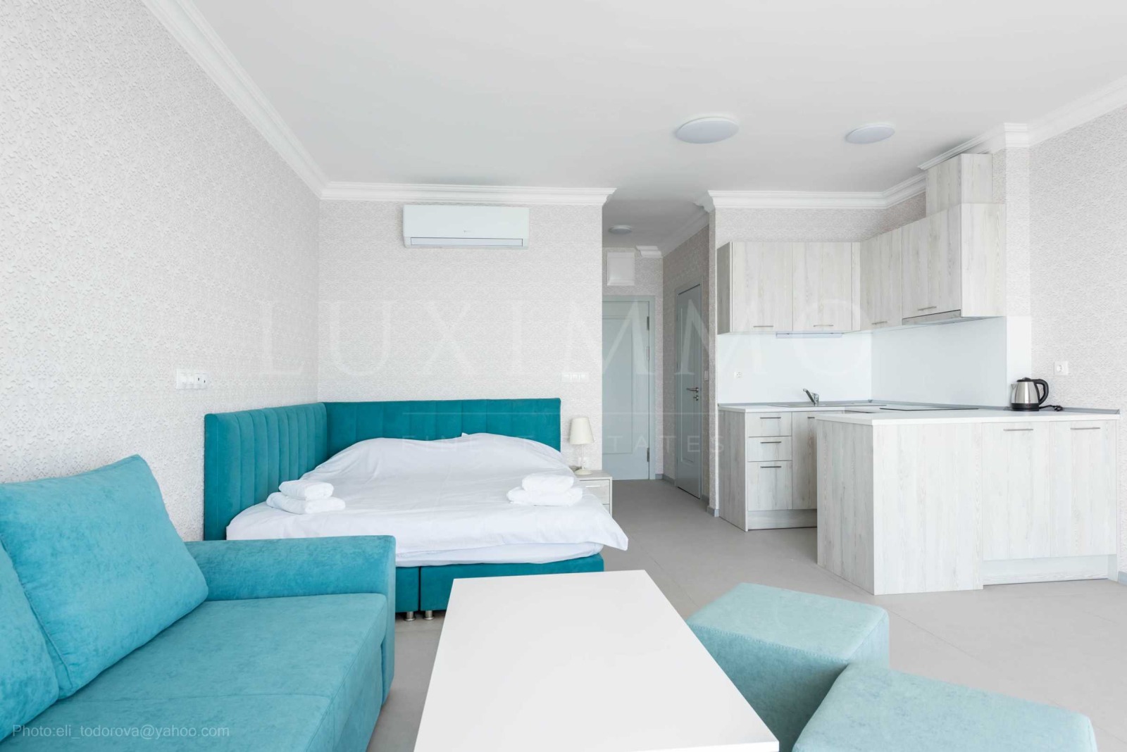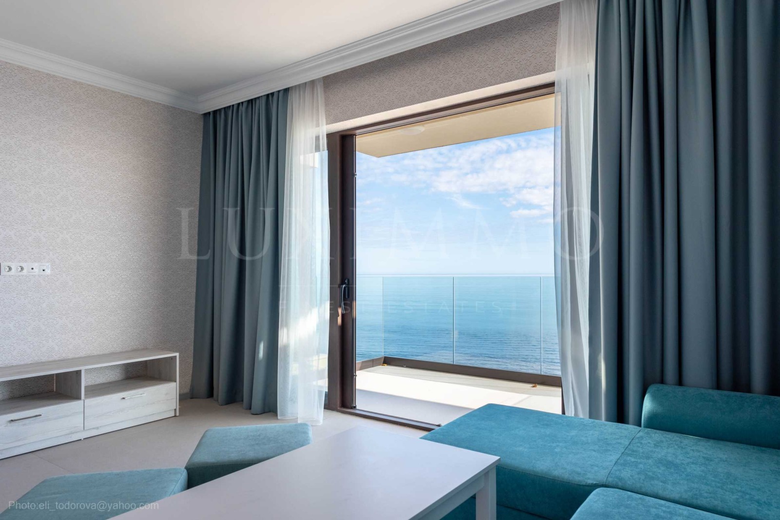 Едностайното жилище е чисто ново, намира се на първи етаж в бутикова сграда с басейн и удобства, на самия морски бряг.