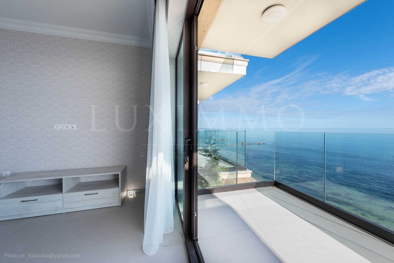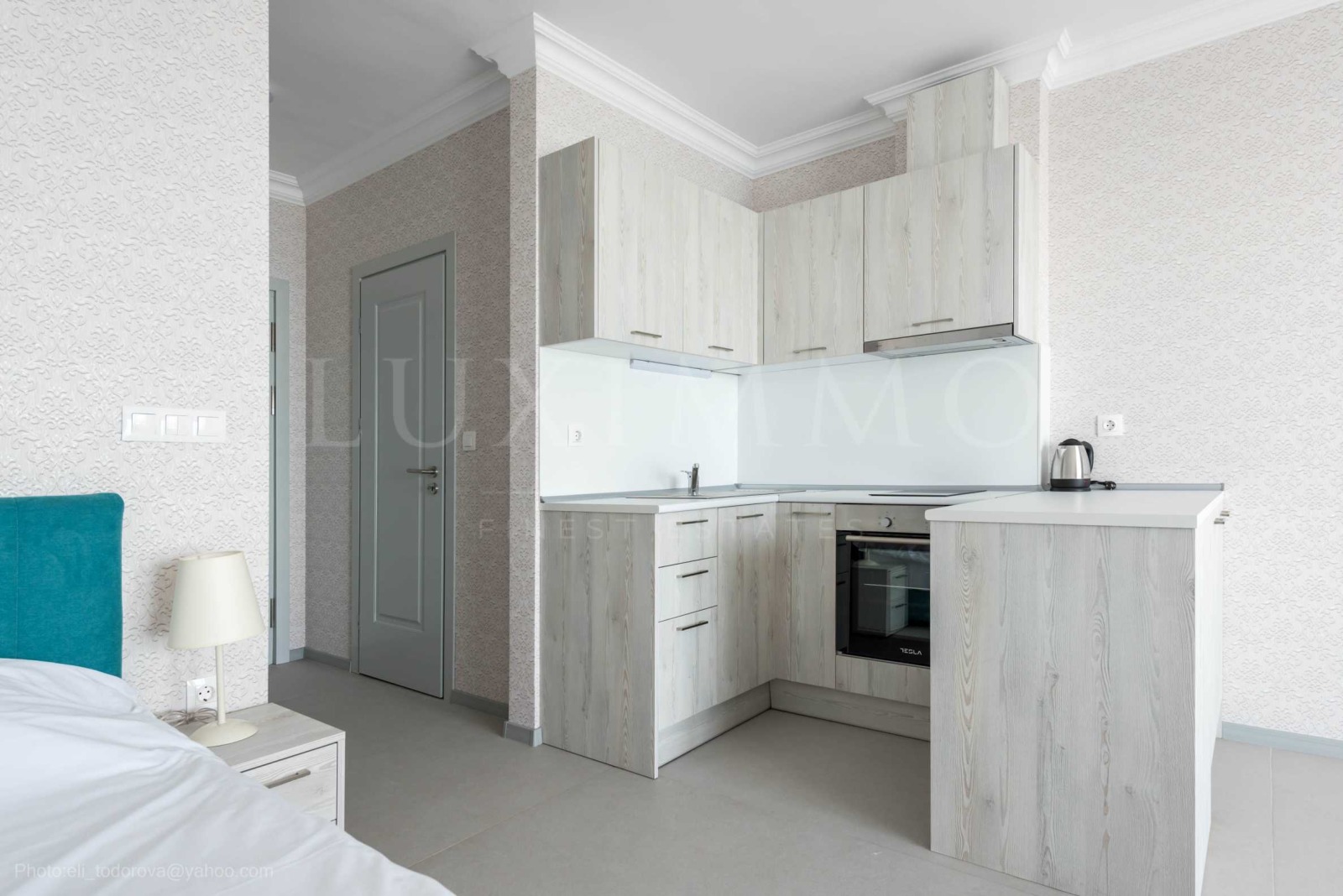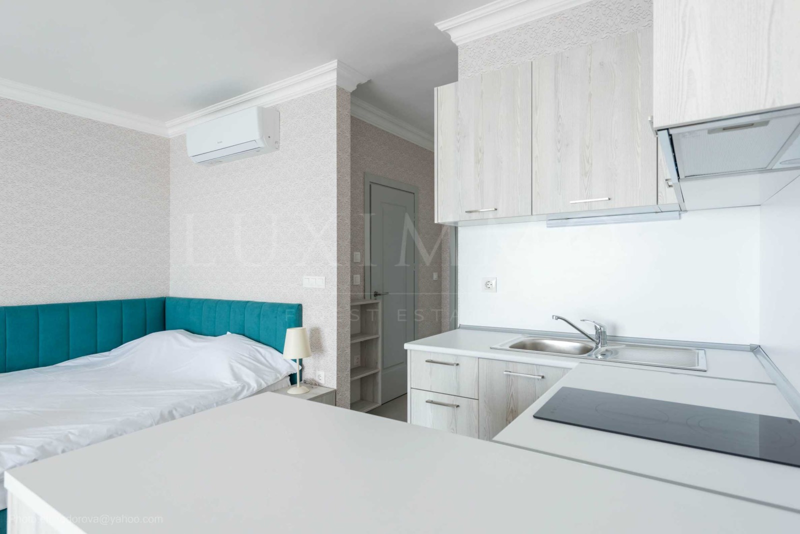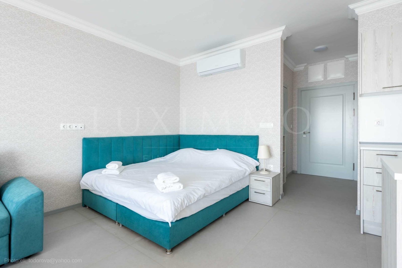 Едностайното жилище е чисто ново, намира се на първи етаж в бутикова сграда с басейн и удобства, на самия морски бряг.