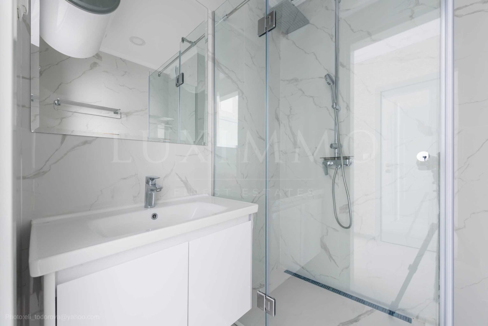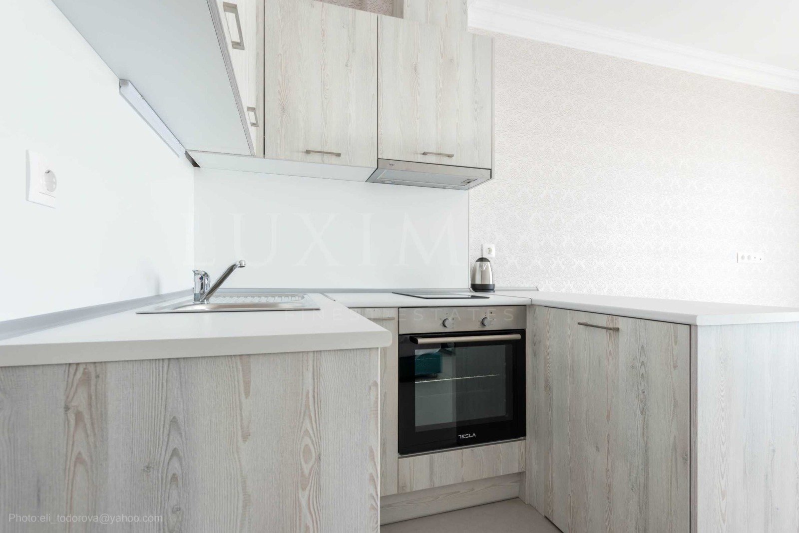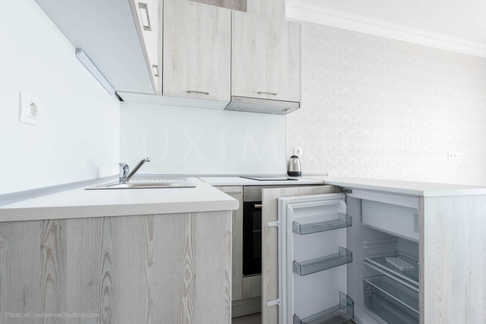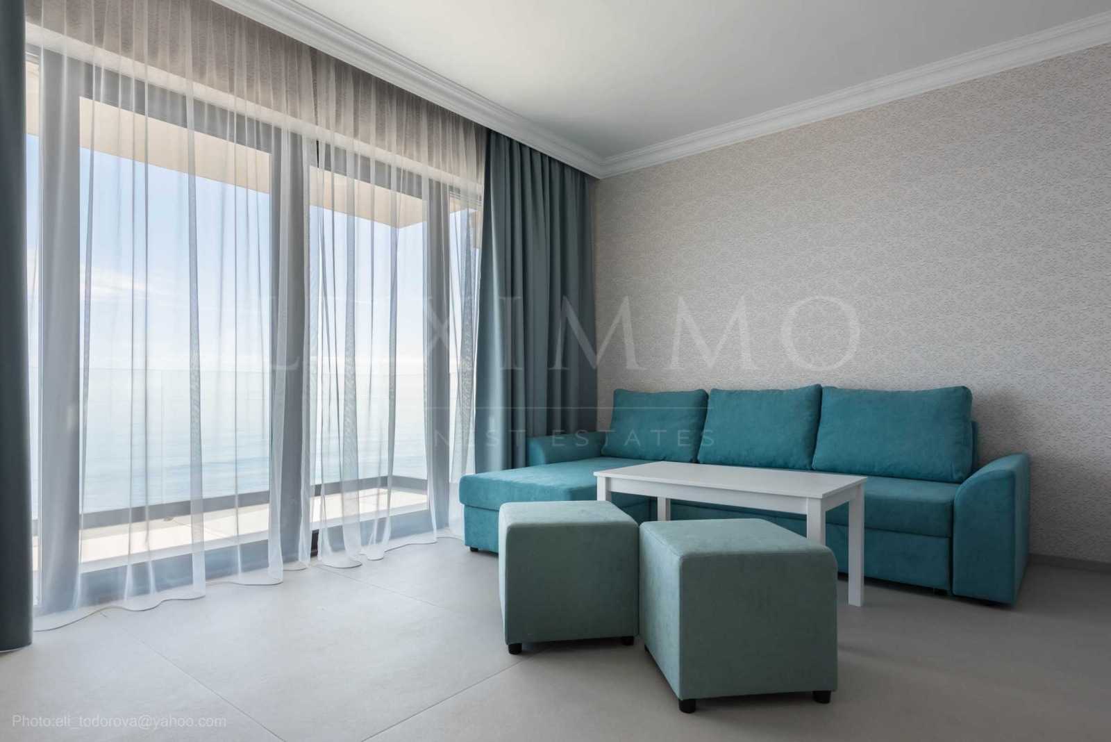 Имотът е качествено обзаведен и оборудван, предлага атрактивен, светъл интериор, с напълно оборудвана кухня, баня с душ кабина, дрешник и голяма панорамна тераса, от която да се наслаждавате на директната гледка към хоризонта на Черно море.