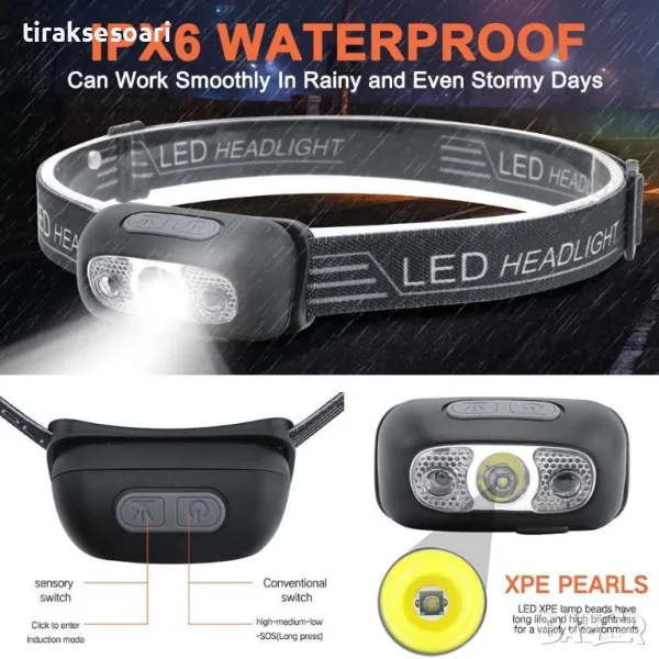 LED челник Фенер за глава 350 лумена със сензор за движение и кабел