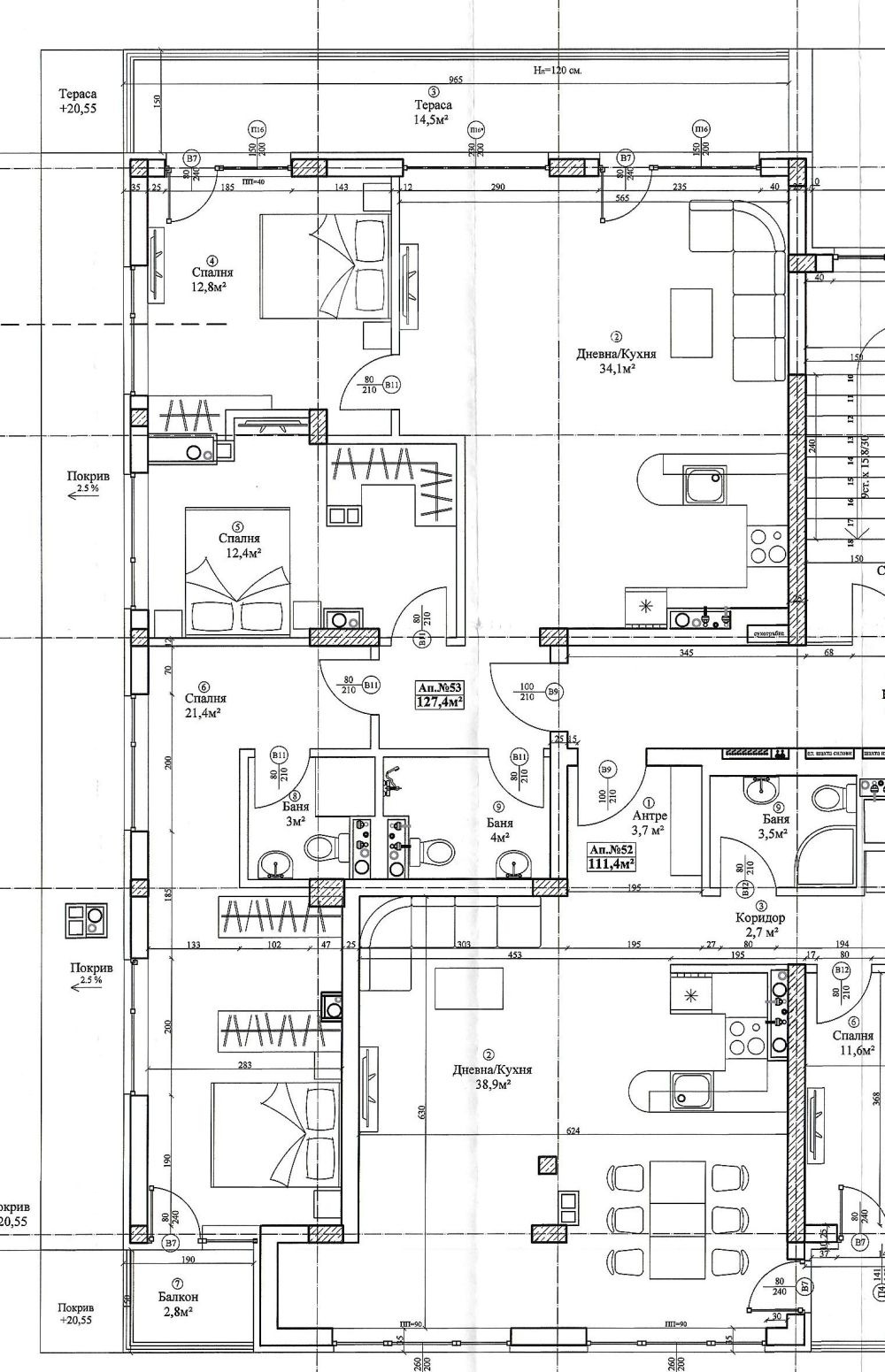 Многостаен апартамент със застроена площ от 128 кв.м. Състои се от: хол 34 кв.м., две самостоятелни спални, една преходна от хола спалня, баня с тоалетна и панорамна тераса в източна посока с гледка към парк и Лозен планина. Изложенията са изток, север и запад.