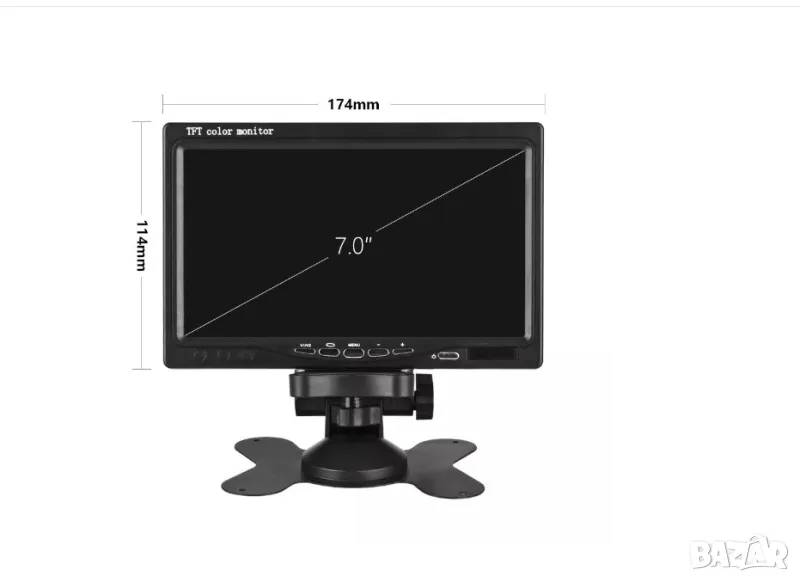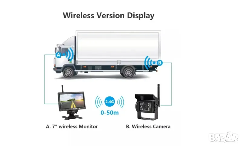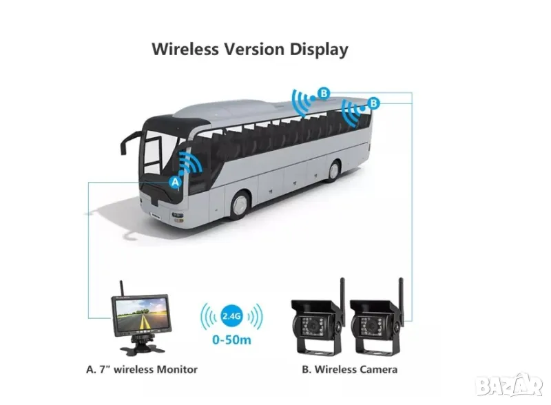 Безжичната система за видеонаблюдение на превозни средства се състои от 7-инчов дисплей и две камери с висока разделителна способност. Аксесоарите включват антена, захранващ кабел, стойка за монитора, винтове и дистанционно управление. Мониторът и камерата могат да бъдат свързани към захранването на автомобила отделно, инсталация е лесна.