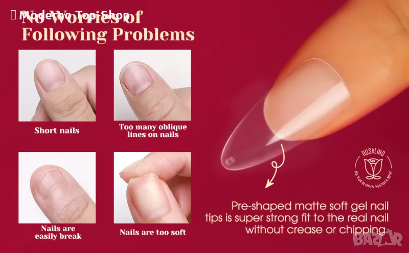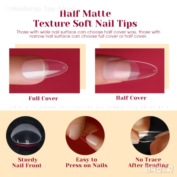 Изработени от акрил гел типси във форма Бадем. Всяка кутия съдържа 264 бр. типси в 12 размера, за да подберете най-подходящата ширината за нокътната плочка.