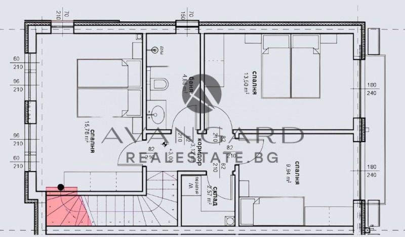 Втори етаж - коридор, три спални, баня с тоалетна и складово помещение.