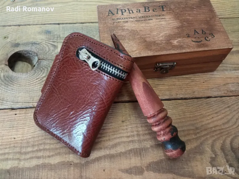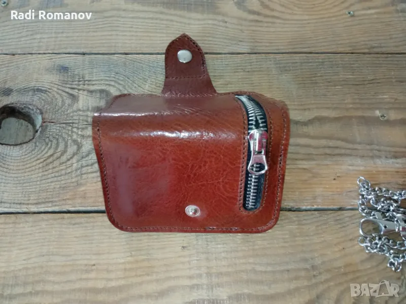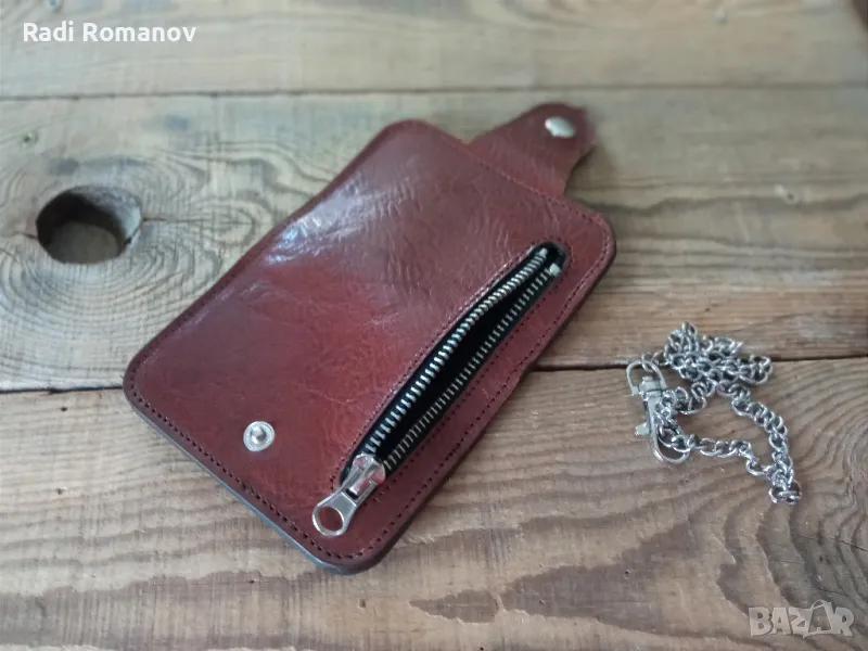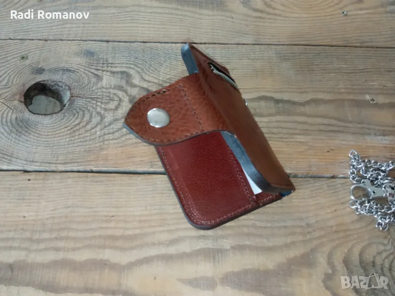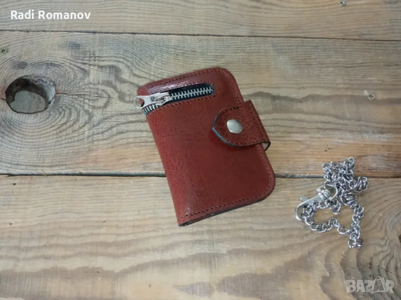 Ръчно изработен мъжки кожен портфейл.Джобен формат 11/7.5 свит.Изработен от висококачествена телешка кожа в цвят на отлежало шотландско уиски.Разполага с 4 вътрешни отделения за карти, лични документи и свити банкноти и външно портмоне с метален цип за монети, банкноти и т.н