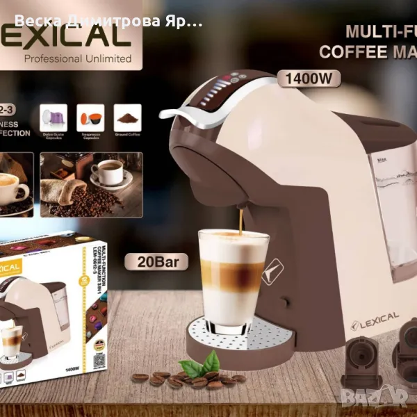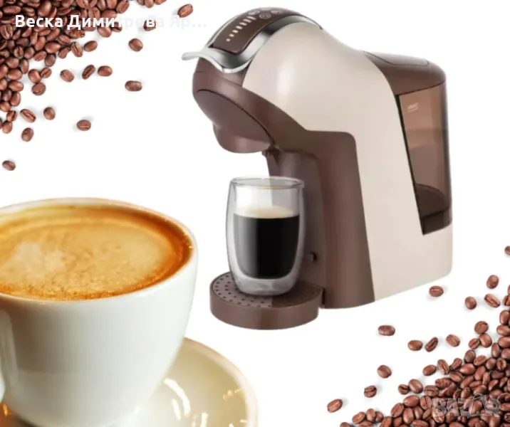 Мощност: 1400 W; Напрежение: 220-240V~50/60 Hz; Помпа за налягане: 20 бара, осигуряваща оптимално извличане на кафе; Сензорен екран: Да, с автоматична технология за лесно управление; Температурни опции: Три различни нива за персонализиране на напитката; Контрол на водния обем: Седем нива на обем на водата, за перфектното количество във всяка чаша; Поддръжка на кафе системи: Съвместима с капсули Nespresso, капсули Dolce Gusto и мляно кафе; Цветове: Бял и бежов, за да отговарят на вашия личен стил и предпочитания; 24 месеца гаранция.