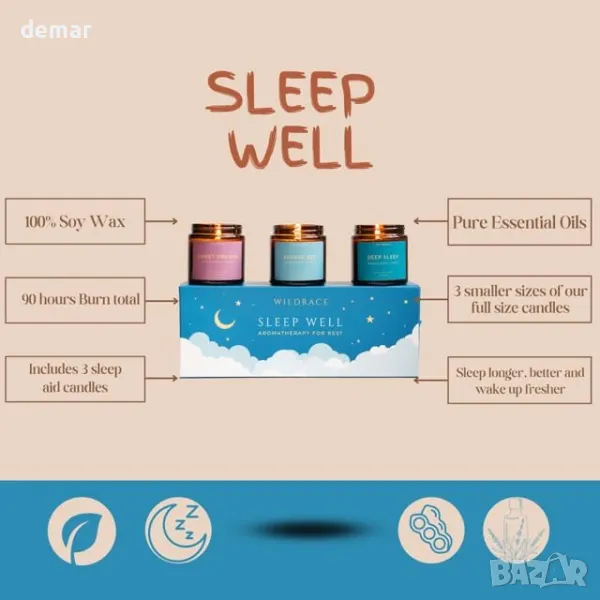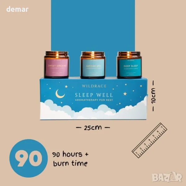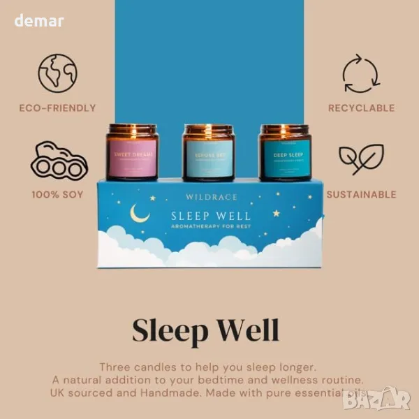 Този луксозен подаръчен комплект за сън, ръчно изработен в Есекс, включва свещи от естествен соев восък, напоени със 100% чисти етерични масла за релаксация и подобрен сън. Сместа "Deep Sleep" съчетава мащерка, лавандула и иланг-иланг, докато сместа "Before Bed" включва градински чай, нероли, здравец и лавандула. За "Sweet Dreams" комбинацията от кедрово дърво, лимонова върбинка, лавандула и иланг-иланг създава успокояваща атмосфера. Комплектът е 100% без пластмаса, което го прави екологичен вариант за тези, които търсят спокойна нощна почивка.