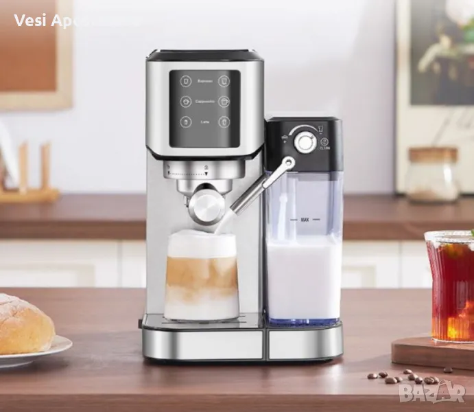 Мощност: 1300 W; Напрежение: 220-240V~50/60 Hz'; Помпа за налягане: 20 бара, за оптимално извличане на аромата и вкуса; Резервоар за вода: 1000 мл, подвижен и прозрачен; Резервоар за мляко: 700 мл, разглобяем и прозрачен'; Котел: Изработен от лята под налягане алуминиева сплав, за бързо и равномерно нагряване; Дюза за пяна: Подвижна, за перфектна млечна пяна; 24 месеца гаранция; Подвижна тава за капки: Да, за лесно почистване и поддръжка.