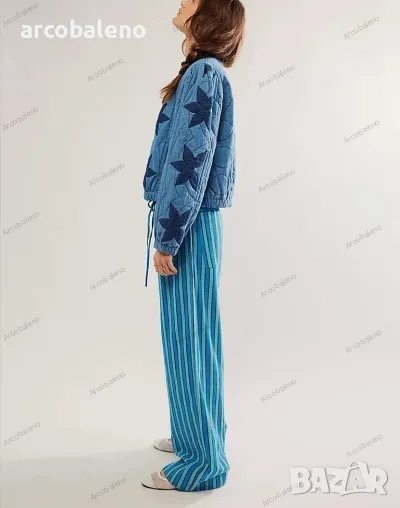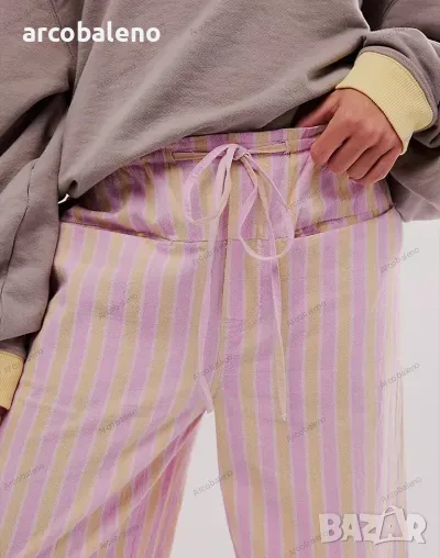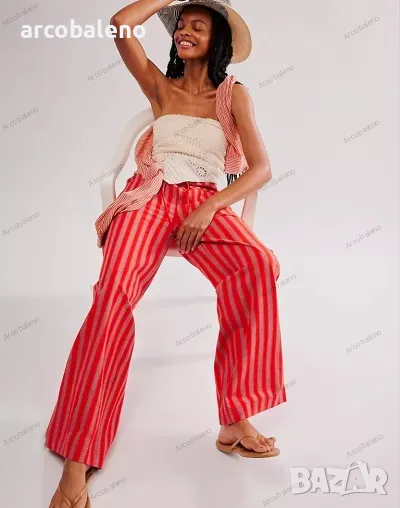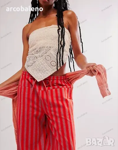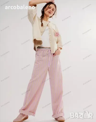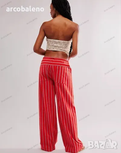 Ежедневни дамски прави широки панталони на райета с шнур и ниска талия
