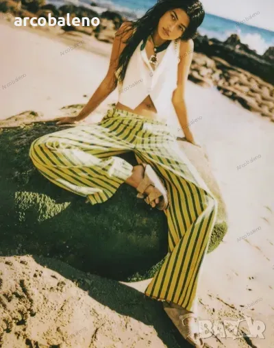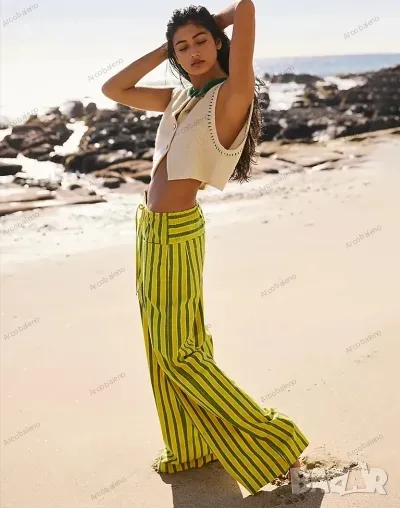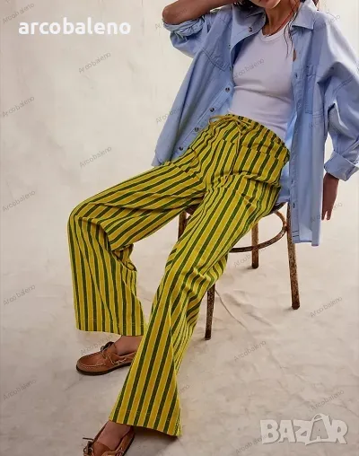 Ежедневни дамски прави широки панталони на райета с шнур и ниска талия