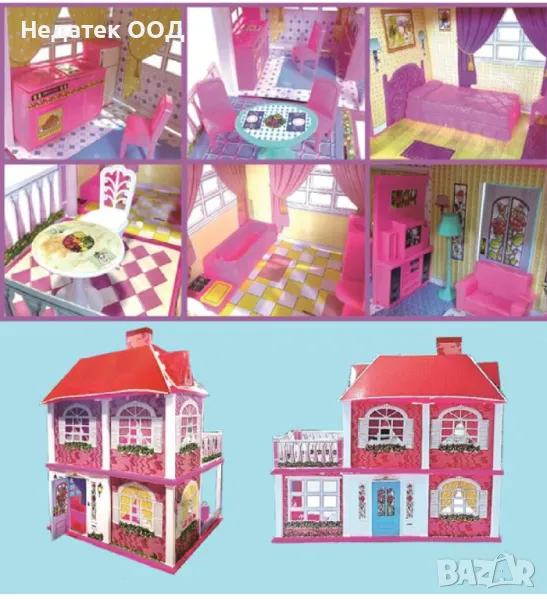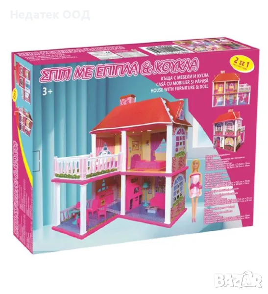 Вила на 2 етажа, вътрешен двор и голям балкон. Има мебели във всяка стая, цветни тапети и подове и врата, която се отваря и затваря. Може да се сглоби в 2 версии и балконът може да бъде поставен от всяка страна, която желаете. Размерите в зависимост от монтажа могат да бъдат 83.5x25.5x70cm или 58.5x50.5x70cm. Включва кукла, облечена в розова рокля и дълга руса коса.