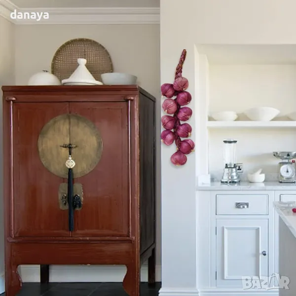 Реалистичен изкуствен червен лук, изплетен на връзка от 12 броя глави. Чудесен за декор и украса в битов кът, кухня, декориране на заведения, магазини и всякакъв тип помещения. Ръчна изработка.