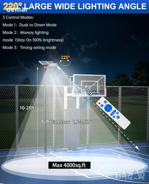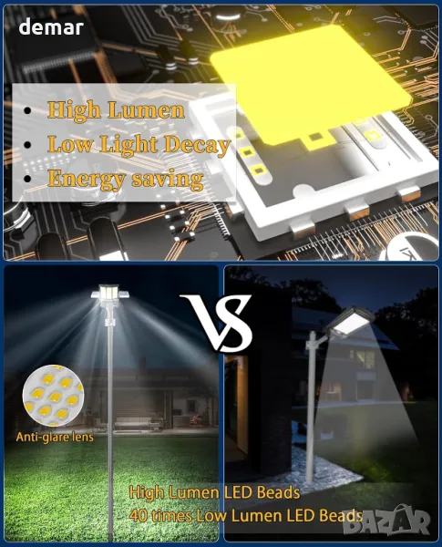 Това 8000 W соларно улично осветление включва 144 ярки LED перли с технология на изпъкнали лещи за равномерна, далечна светлина. Той предлага два метода на управление: режим от здрач до зазоряване за автоматична работа и постоянно включен режим с регулируема яркост. Светлината, захранвана със слънчева енергия, се зарежда за 6-8 часа и издържа над 28 часа, с дисплей с индикатор за батерията за следене на нивата на зареждане. Той осветява до 370 квадратни метра с широкоъгълно осветление, има батерия от 60 000 mAh и работи при всякакви метеорологични условия със своя IP67 водоустойчив алуминиев дизайн. Инсталирането е лесно на стълбове или стени, идеално за улици, паркинги и др.