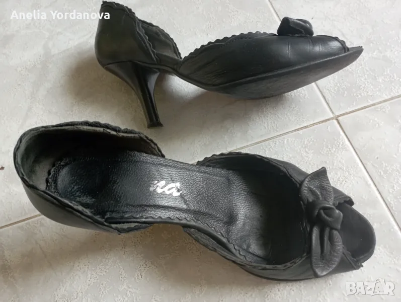 6. Черни обувки, естествена кожа отвън и отвътре, носени, но запазени. По номерация са 35, но са по-големи. Ток 7 см. Стелка 23 см.