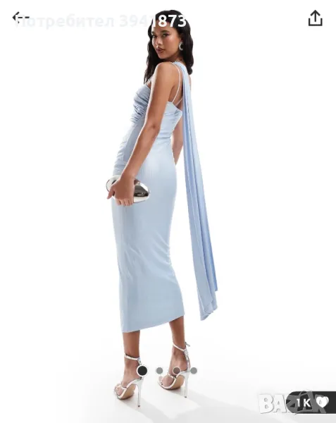 Официална рокля Asos (тип гръцка богиня) с леко наметало, цвят светло синьо с лек металически отблясък.